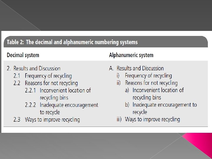 The section in which you present and interpret findings can go over several pages in some reports. In this case, you will need to use subheadings to indicate clearly what the findings are. For instance, if your survey is on people’s experience with recycling, and your survey had questions related to their practice of recycling, you might divide your Results section according to what the survey found, using headings like these: