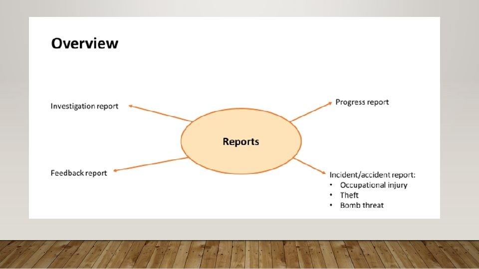 N 5 & N 6 Module 10: Reports (continued) ACCIDENT REPORTS An accident report is a very important document in any organisation. Most large companies have a standardised form that is usually filled in by a responsible member of the staff, e. g. the personnel manager. This is done whenever an accident occurs during working hours. It must be filled in completely and correctly. Depending on the type of accident, copies of the report may have to be sent to the police and it is often needed for insurance purposes.