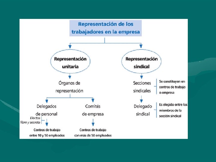 Representación sindical *Las secciones sindicales Los trabajadores afiliados a un sindicato tienen el derecho a constituir en un centro de trabajo o empresa las secciones sindicales. Las secciones sindicales eligen de entre sus miembros a un trabajador para que los represente. Este es el delegado sindical. Según la Ley Orgánica de Libertad Sindical, reconoce como delegado sindical a los delegados de las secciones sindicales que: - Se constituyan en empresas o centros de trabajo con menos de 250 trabajadores - Sean de sindicatos que tengan presencia en el Comité o Junta de Personal.
