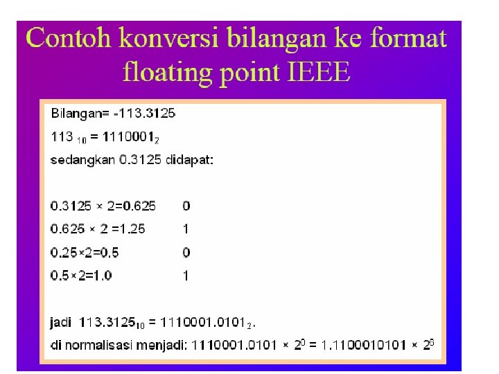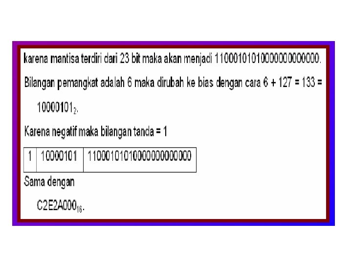 • Tuliskan Representasi FLOATING POINT dengan 32 bit -0, 000000110112 = 1, 1011 x 2 -7 Data sign : 1 ------> negatif Data Eksponen (8 bit) -7 des = 11111001 + 01111111 = 101111000 bil. Bias 7 Fh Data Signifikan 1011 0000 000 ---> 23 bit Jadi representasi -0, 000000110112 adalah 1011 1100 0101 1000 00002