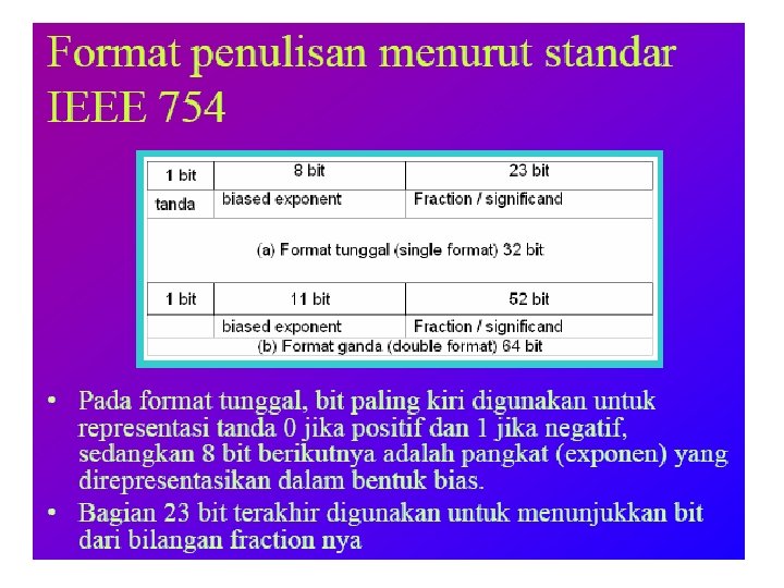 • Format dari standar IEEE 754 tahun 1985 Sign bit, Eksponen+bias, signifikan format floating point 32 bit : 0 1 8 9 31 Pada 64 bit: -1 -||--- 11 bit------| |----52 bit------|