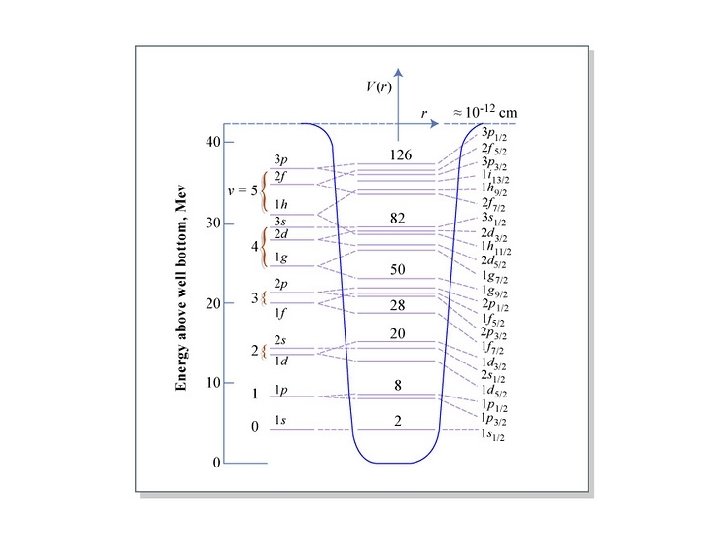 The nucleus can be thought of as a spherical finite potential well that is created and filled by the nucleons themselves. Even though closely packed, the nucleons are quasi-free and they will occupy the energy levels within this well from the lowest energies upward, constrained by the Pauli Exclusion principle. Like electrons filling orbital states in atoms, there are quantum numbers nlm associated with these levels, which nucleons can fill partially or completely. When a given “shell” is filled (see below) the corresponding nucleus will be much more stable than its “nearby” isotopes. This is the basis of the “shell model” of nuclei.