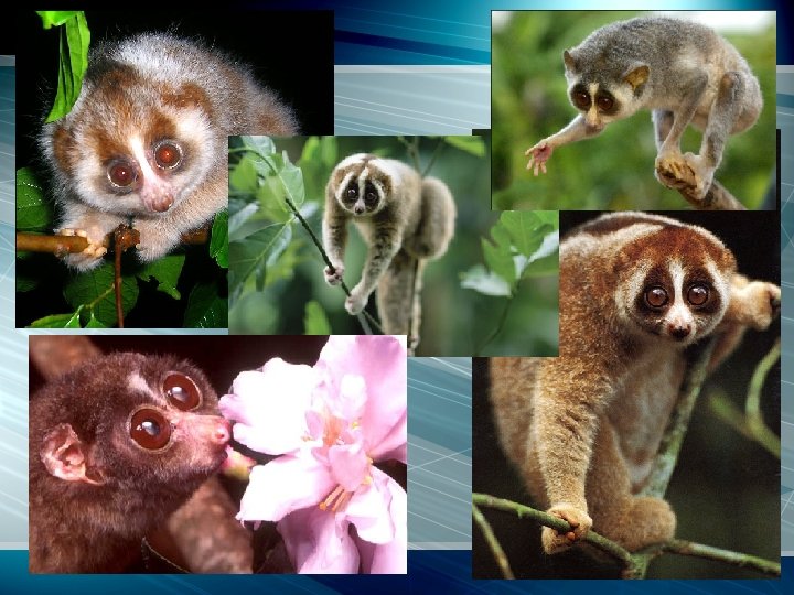 Lorises q. These have adapted to a life similar to the sloth. q. By hardly moving they manage to escape detection. q. Sluggish, solitary and nocturnal, they feed largely on fruit, gum, insects, birds and birds’ eggs. q. They are found in south-east Asia and west Africa.