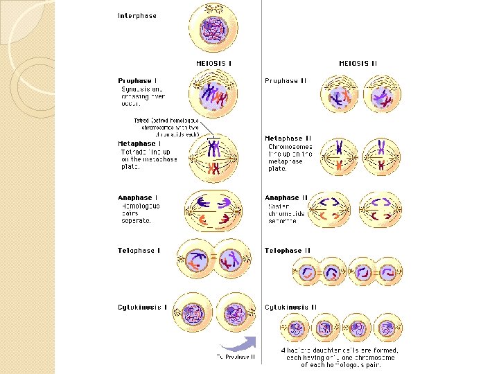 Meiotic Division/Meiosis �During the first phase of meiosis, the double stranded chromosomes line up in pairs in the center of the cell �Then are separated moving to opposite ends of the cell �The cell then physically divides into two cells �The second phase of meiosis involves the division of each of the new cells