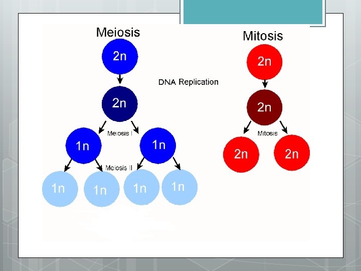 Meiosis Amount of DNA: Half the amount of DNA (haploid, 1 n)