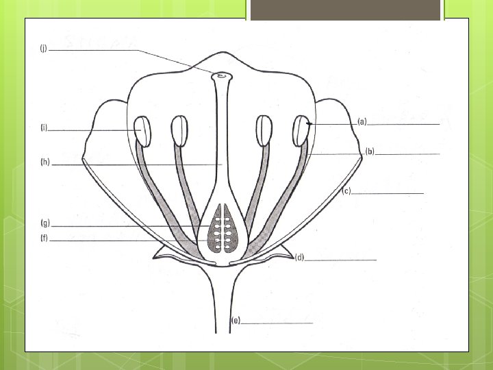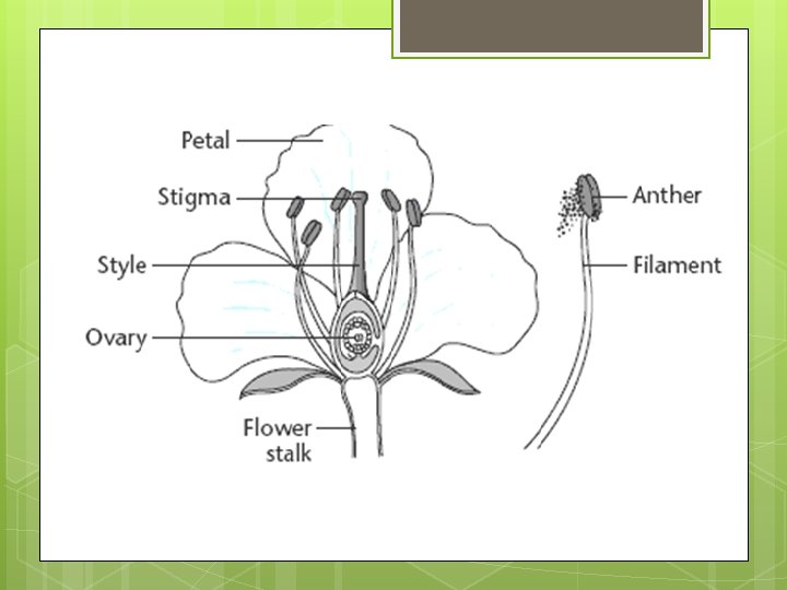 Plant Sex Organs Male Sex Organs: Pollen – male sex cells Stamen - Anther, where pollen is produced - Filament, holds anther away from plant Female Sex Organs: Eggs – female sex cells Pistil – Sticky surface for the pollen to land on Style – travelling chamber from stigma to ovary Ovary – holds the egg
