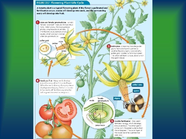 Pollination • Most angiosperms are pollinated by animals; i. e. insects, birds and bats • Flowers have bright colors, sweet nectars, etc. • Insect pollination increases chance that genes will be passed on