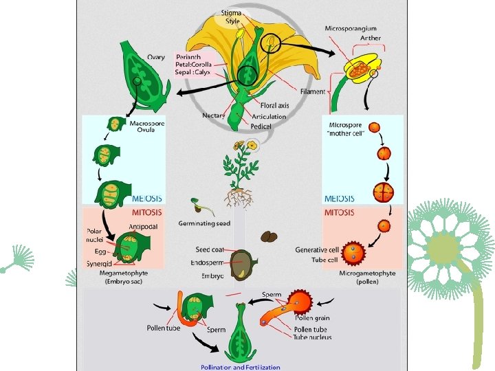 Plant Reproduction Cycle • Step 5: fertilization – male and female gametes combine to produce the zygote • Step 6: seeds develop (fructification) • Step 7: seed dispersal – this can happen by animals, water, wind, the plant itself and humans (ex: sowing seeds) • Step 8: seed starts to grow into a new plant (germination)