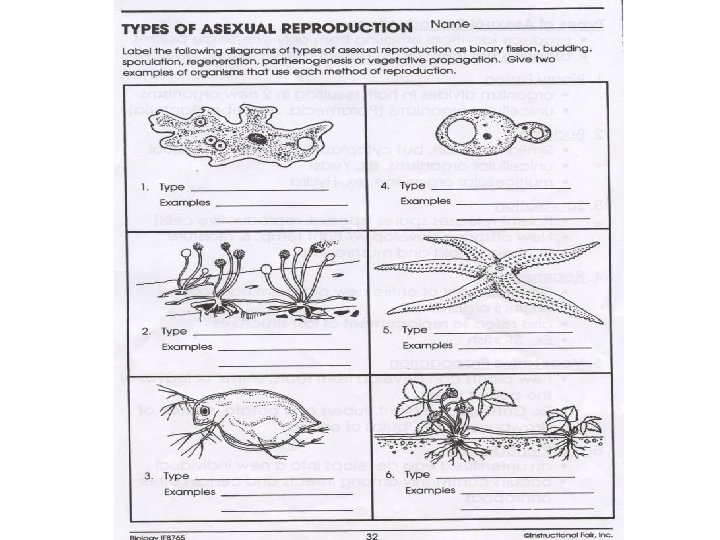 1. _______ – Organism divides in half (EQUALLY), resulting in 2 new organisms – Unicellular organisms 2. _______ – Similar to fission but cytoplasmic division is unequal – Unicellular (yeast) & multicellular (hydra) 3. _______ – Parent releases spores (special reproductive cells) Microscopic – New offspring develop with right temp & moisture