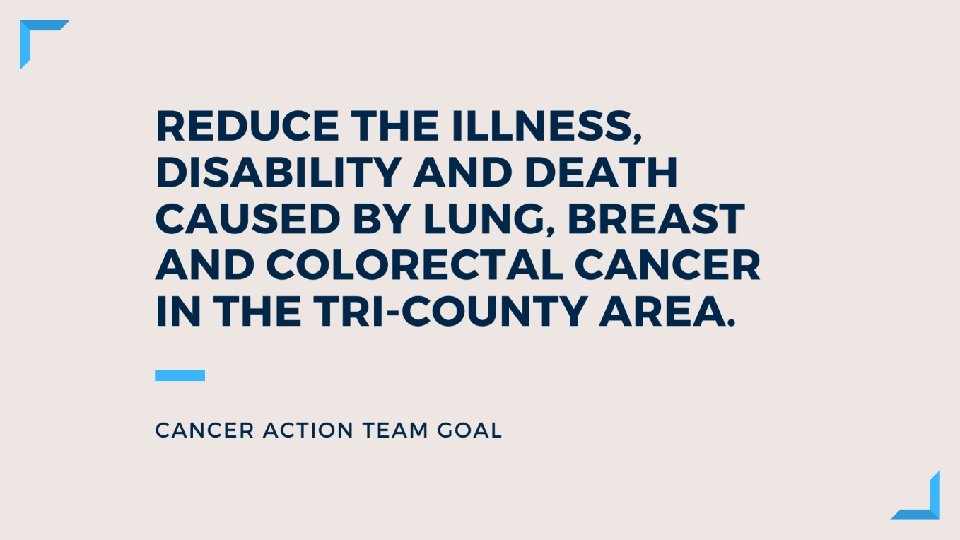 Goal: Reduce the illness, disability and death caused by breast cancer in the Tri-County area. 2017 -2019 Breast Cancer Priority Objective: By 2019, reduce mortality rates by 3% as described by Healthy People 2020 Strategies: 1. Increase the rate of early stage breast cancer detection. 2. Increase the proportion on newly diagnosed women who receive breast cancer treatment