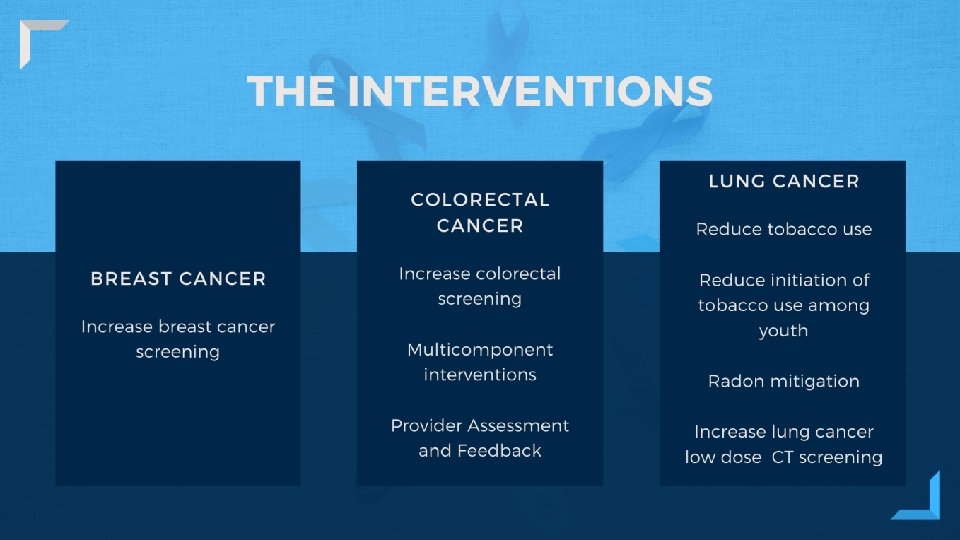 Intervention Highlights 2019 Policy development and use of mass media: Presented the Breast Cancer Position Statement Advocacy and health equity: Supported Senate Bill 162 assuring diagnostic mammogram coverage Collaboration, access to healthcare: Identified partners offering access to care in transportation for rural populations Education, outreach, funding, health equity: Promoted the state breast cancer screening program, guaranteeing mammograms and related services to an increased number of uninsured women throughout the region