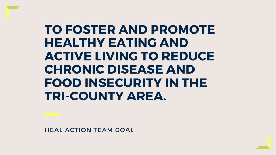 Increase the number of adults and youth who meet the recommended daily servings of fruits and vegetables, and to increase number of adults and youth who meet recommended levels of weekly physical activity 2017 -2019 HEAL ACTION TEAM GOAL