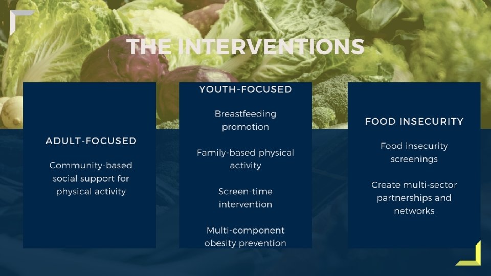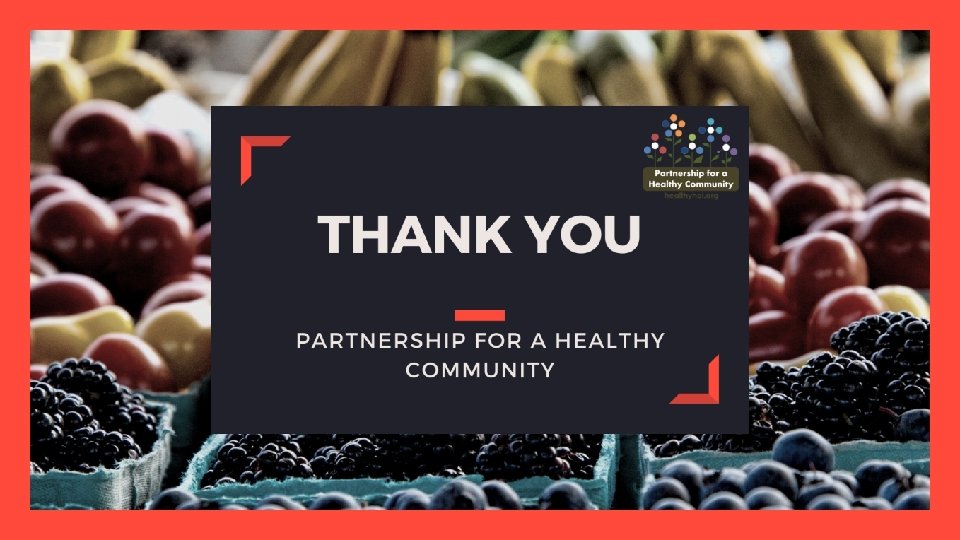 HEAL FOOD SYSTEM PARTNERS Collaborative effort to increase healthy food, advance community education and create agricultural and community development for those that are food insecure in the tri - county $40, 000 Grant • Develop community-based collaboration model • Leverage strengths of partners to address food insecurity • 2 Pilot projects �Cooking classes �Green light labeling system