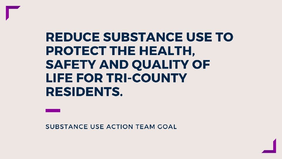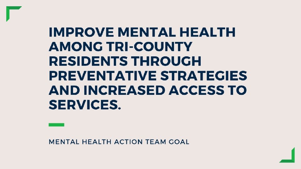 Improve Mental Health through prevention and access to services and reduce Substance Use among tri-county residents 2017 -2019 BEHAVIORAL HEALTH ACTION TEAM GOAL