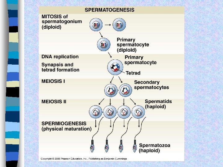 So where does meiosis happen? Tissue of testes is full of seminiferous tubules n In walls of tubules, stem cells that give rise to sperm are constantly undergoing meiosis n Sperm are then collected in epididymis n Sperm that are not ejaculated are reabsorbed back into testicular tissue n