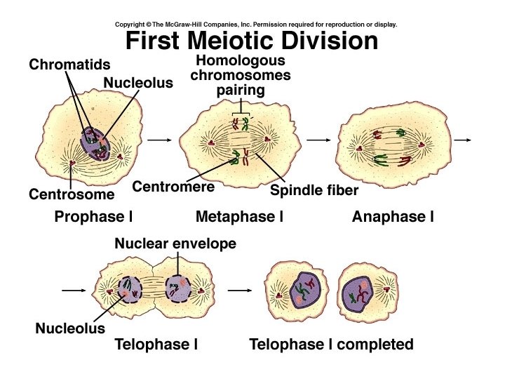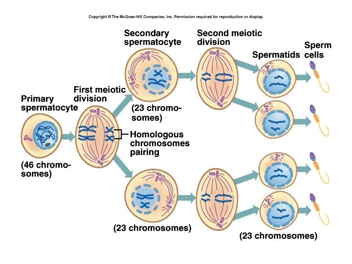 • First phase of meiosis the primary spermatocyte enlarges, and duplicates its DNA. It then goes through two nuclear divisions, resulting in 4 cells with n chromosomes. • During first division homologous pairs of chromosomes line up in the center of the cell – synapsis. • Crossing-over may occur and increase genetic variability by recombination of genes.