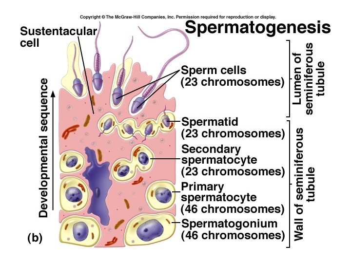 Meiosis in the male • Spermatogenesis takes about 65 -70 days. • Begins with spermatogonium – 2 n • First division is through mitosis – one daughter cell remains near basement membrane of the seminiferous tubule, the other forms sperm – • primary spermatocyte (2 n) • Sperm production stops here until puberty.
