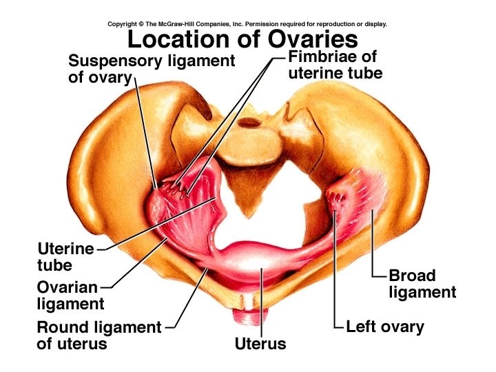 Ovaries • Located in upper pelvic cavity, on either side of uterus • Held in place by a number of ligaments • Descend from abdominal cavity to pelvic brim