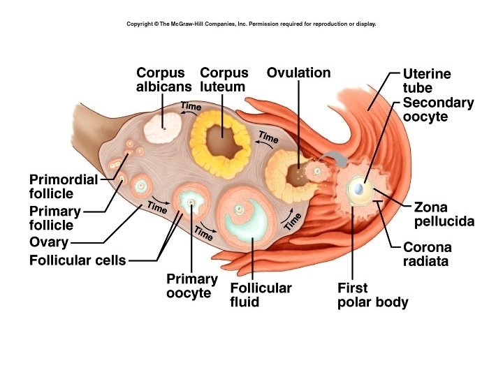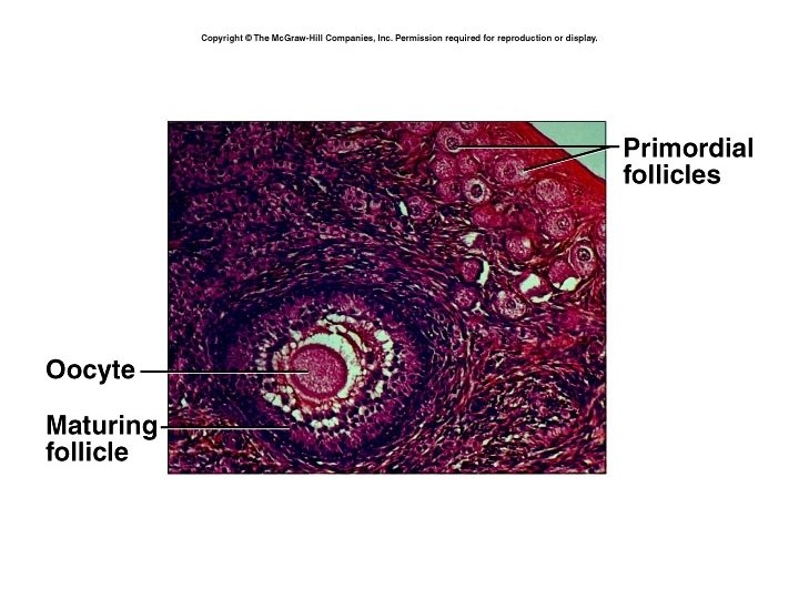 • Primordial follicle – primary oocyte and single layer of follicular cells • Under influence of FSH, become primary follicles which have several layers of cells. • Layer of glycoprotein, the zona pellucida, separates oocyte from the granulosa cells. • Ovarian cells outside follicle form two layers: – Inner vascular layer (theca interna) that secretes hormones – Outer fibrous layer (theca externa) – connective tissue.