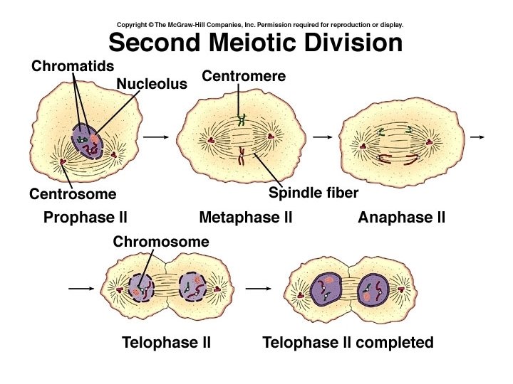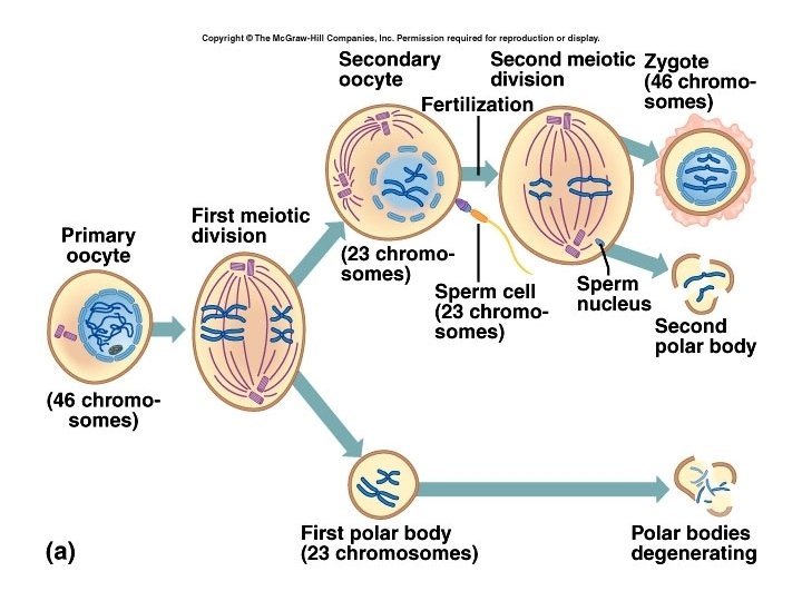 • At ovulation, secondary oocyte and polar body are released. • If not fertilized, degenerates. • If penetrated by sperm, meiosis resumes, forming ovum and another polar body. • Nuclei of ovum and sperm unite to form a zygote. (2 n or diploid) • So, meiosis results in ONE OVUM and a polar body (which degenerates)