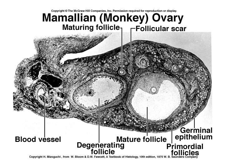 • Each ovary has a hilus – blood vessels and nerves enter • Several layers: – Germinal epithelium – simple squamous cells – Tunica albuginea- white capsule of C. T. – Stroma – connective tissue, can be divided into: • Medulla – loose connective tissue, blood vessels, nerves • Cortex - contains ovarian follicles – consist of oocytes at various stages of development