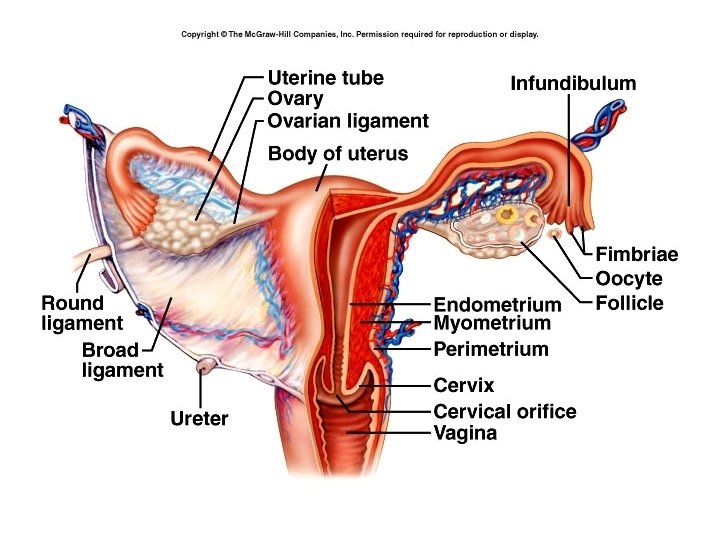 Uterine (Fallopian) Tubes • • Extend laterally from uterus Open end is funnel shaped – infundibulum Many finger-like projections – fimbriae Local currents produced by movement of fimbriae draws ovum into uterine tube. • Uterine tube is lined with ciliated columnar epithelium, which move ovum along. • Peristaltic movements also propel ovum toward uterus.