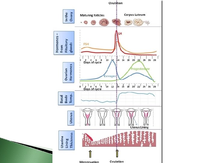 The Menstrual Cycle Menarche – a woman’s first menstrual period Cycle controlled by levels of FSH and LH produced by pituitary gland Estrogen and Progesterone produced by the ovary