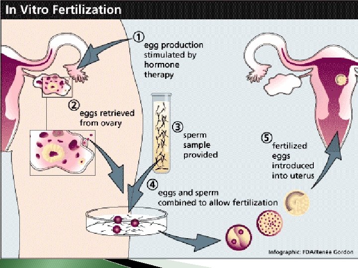 In Vitro Fertilization (IVF) Manually fertilizing an egg outside of the womb by combining it with sperm Typically performed in a laboratory dish An embryo transfer then takes place where the fertilized egg (now an embryo) is then implanted into the mother’s womb