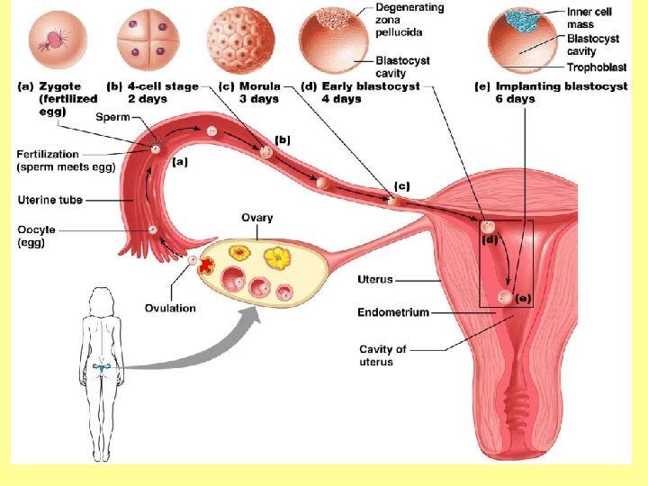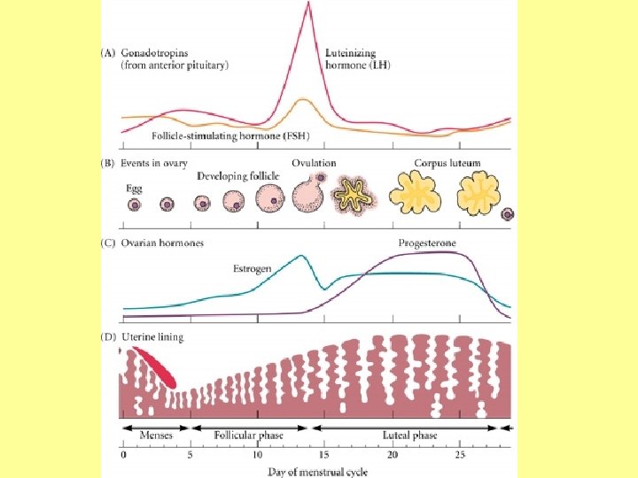 Uterine (Menstrual) Cycle • Days 1 -5: Menstrual (Menses) Phase – uterus sheds all but the deepest part of the endometrium • Days 4 -14: Proliferative (Follicular) Phase – endometrium rebuilds itself due to rising estrogen levels (released from growing follicles) • Days 15 -28: Secretory (Luteal) phase – endometrium prepares for implantation of the embryo by increasing blood flow and nutrients due to rising progesterone levels (released from corpus luteum)