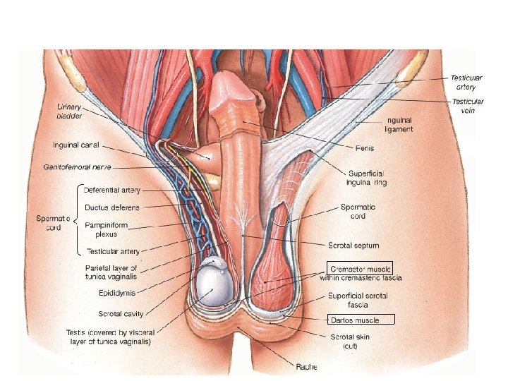 Spermatic Cord • Layers of connective tissue, fascia and muscle • Encloses ductus (vas) deferens, testicular artery, testicular vein and nerves Thermoregulation by muscles in Scrotum • Dartos muscle wrinkles skin of scrotum • Cremaster muscle pulls testes closer to body