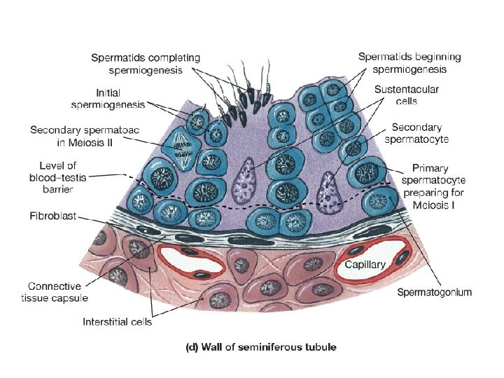 Seminiferous tubules • Site of sperm production – Sperm move to straight tubule – On to rete testis • Efferent ducts connect rete testis to epididymus • Interstitial cells – Between seminiferous tubules – Secrete androgens