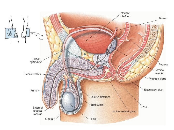 Testes • Enclosed in scrotum – 2 inches by 1 inch • Descent of testes through inguinal canals – During 7 th month of development – Prior to descent, held in place by gubernaculum testis • No descent - cryporchidism - sterile
