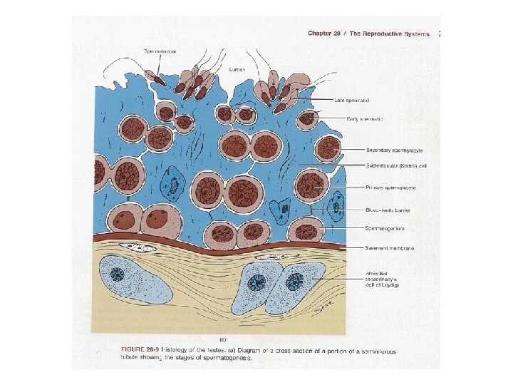 • Lined w/ – Germ cells • Proliferative • Mature to spermatozoa – Migrate basement membr tubule lumen w/ maturation – Sertoli cells • “Hold” sperm • Form blood-testis barrier – Help protect sperm from some toxicants