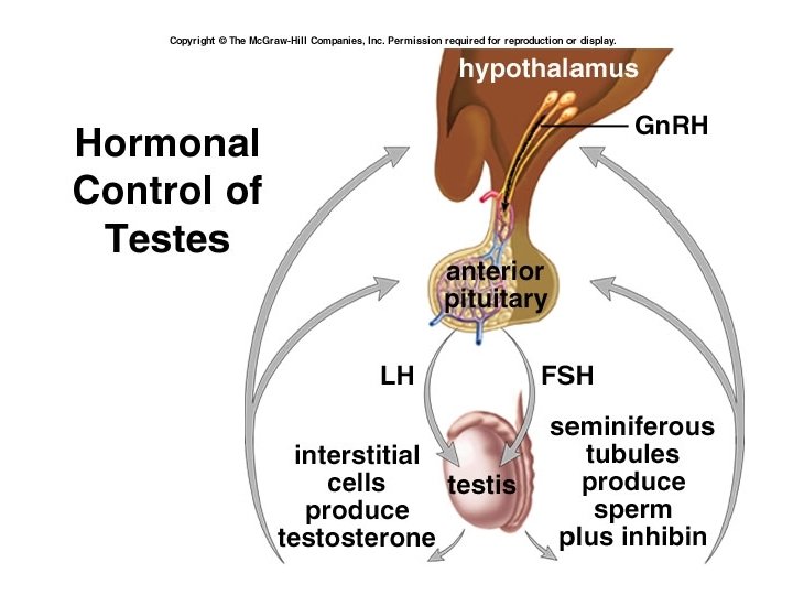 Hormones Regulate Testicular Activity • Gn. RH (hypothalamus) stim’s release – FSH • From anterior pituitary • Required to initiate spermatogenesis – LH • From anterior pituitary • Stim’s testosterone synth/release from Leydig cells