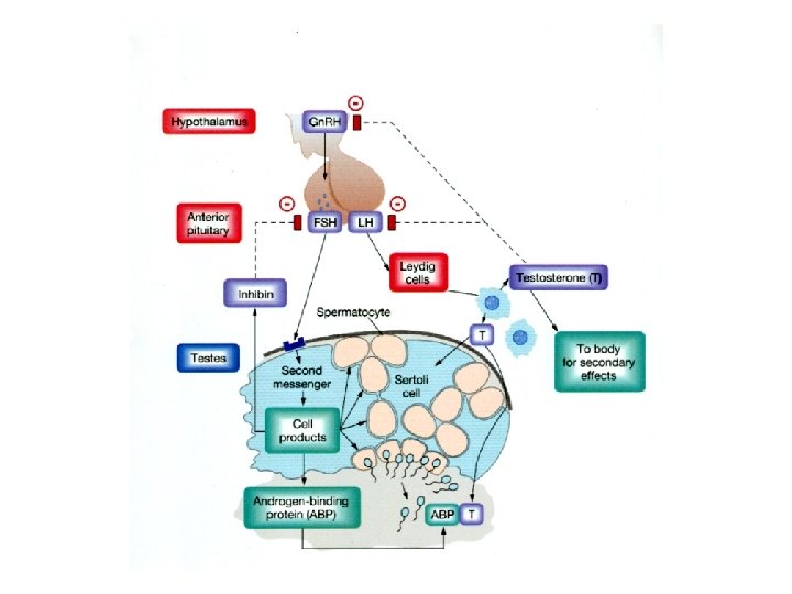 • Testosterone – Spermatogenesis progression, maturation, maintenance – Accessory sex glands – Negative feedback to anterior pituitary • Alterations – Anesthetics, stimulants, drugs of abuse • Alter hypothal-pit-gonadal axis (so Gn. RH, FSH, LH) – Exogenous steroids, alcohol • Interfere w/ steroid metabolism • May affect hormonal balance
