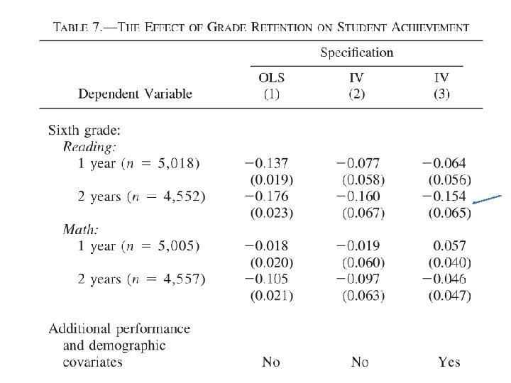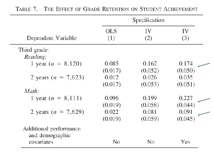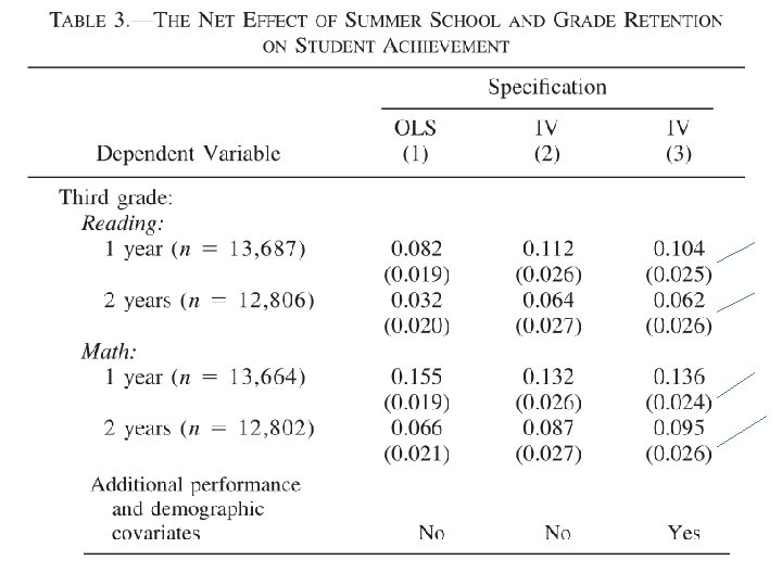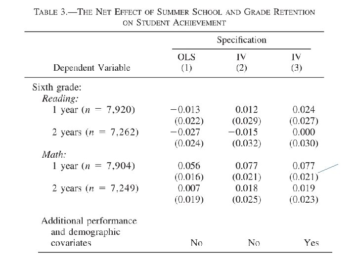 Amostra: Estudantes de 3 a e 6 a série de 1997 a 1999 cujo score de matemática estava em junho acima do cutoff e cujo score de reading estava dentro de um intervalo +- 0. 2 grade equivalents of the cutoff. Efeitos fixos para ano foi incluído em cada modelo. Resultados: Estimativas de OLS não são estatisticamente diferentes das estimativas de IV desistência é aleatória ou não correlacionada com os resultados futuros. Estimativas da 3 a coluna controlam para um conjunto detalhado de características dos alunos (prior math and reading test scores, race, gender, SES, neighborhood poverty, and free lunch status) – estimativas nao diferem das apresentadas na 2 a coluna, o que providencia evidência adicional que os instrumentos são válidos.