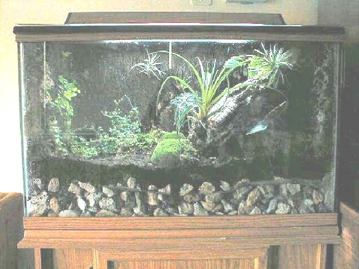 Environment : Tropical Glass Tank (based on size of animal) ◦ Water proof because of high humidity Screen Lid for ventilation Substrate: ◦ Stones on bottom for drainage ◦ On top: moss, reptile bark, coconut husks or soil mixture MUST HOLD MOISTURE Basking sight (rock) Plants (live or fake) UVB or Florescent Lighting