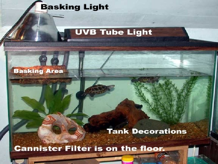 Environment: Turtles Glass Tank Screen lid for ventilation Water ◦ Treated for chlorine ◦ Heated (low heating requirements) ◦ FILTER Clean regularly Basking sight Plants (Live or Fake) UVB or Florescent lighting
