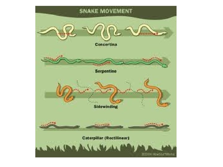 movement • Lateral undulations: 1. Most common 2. Head moves side to side causing wave of muscular contractions 3. Snake uses sides of its body to push off of ground 4. Snake moves forward in S-shaped path