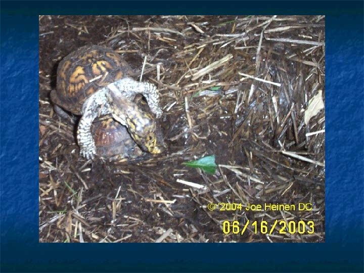 Order Chelonia n n Biting, ramming, hooking are directed at other males Biting - head & limbs Ramming - rearing up, smacking shells Hooking - bulldozing under plastron to flip or hurry