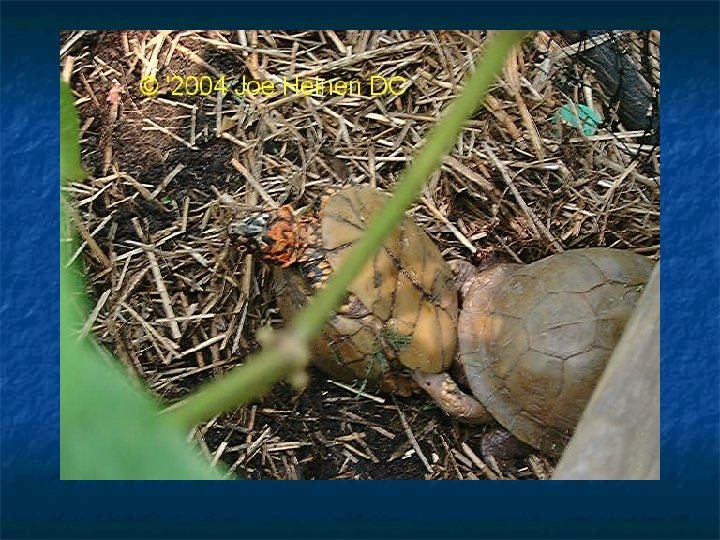 Order Chelonia n n n Mating & reproduction Many varieties of courtship Males of aquatic species may swim around looking for proper leg stripe pattern Pheromones also Males use claws