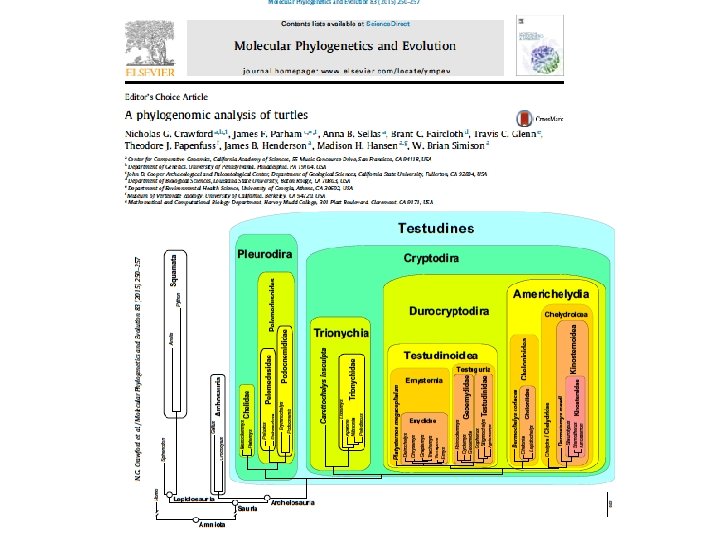 – Morphology; parsimony • Shaffer et al. (1997) – mt. DNA, morphology; parsimony Cryptodira • Gaffney and Meylan (1988) Pleurodira Turtle phylogeny • Fujita et al. (2004) – n. DNA; likelihood • Krenz et al. (2005) – mt. DNA, n. DNA; parsimony, likelihood, Bayesian • 2010 – Thomson and Shaffer (50 kb n. DNA, mt. DNA; parsimony; 'sparse supermatrix') – Barley et al. (10+ kb n. DNA, mt. DNA; likelihood, Bayesian) – Sterli (morphology, n. DNA, mt. DNA, fossil taxa; parsimony) • 2015 – Crawford et al.