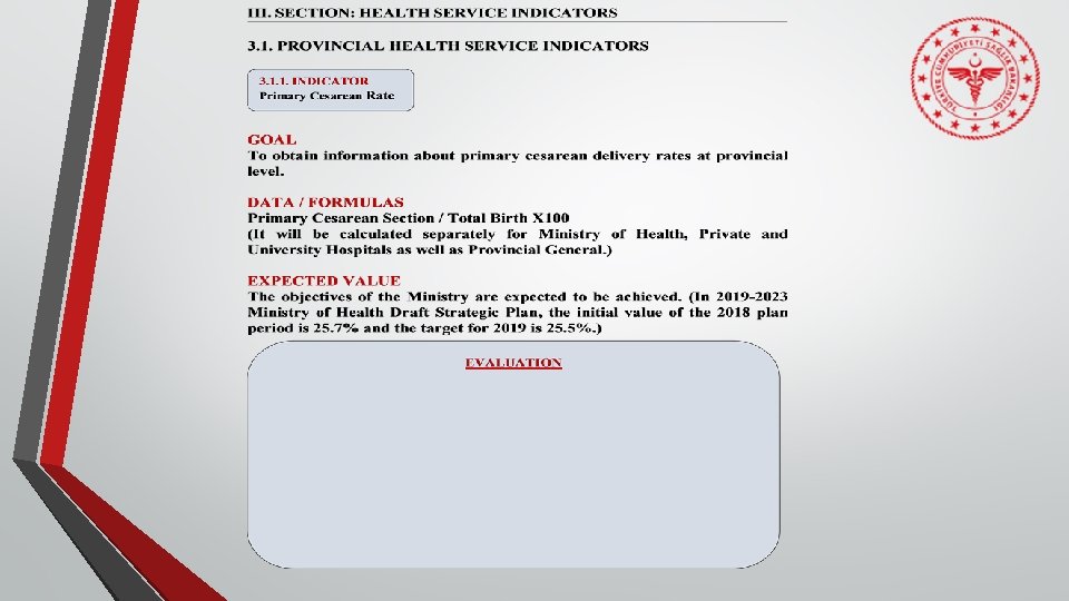 Historical process of quality evaluations Quality studies have been started by preparing quality criteria and selfevaluations have been made in these hospitals with this criterias. Afterwards, evaluations were started to made by the Performance and Quality Coordinatorships within the Provincial Health Directorates. Between 2007 and 2010, the evaluation process continued under the name “Cross. Evaluation” to share good practices and experiences between the provinces Evaluations conducted in all health institutions across Turkey took its final shape by the end of 2010 under the name of “Central Evaluation”.