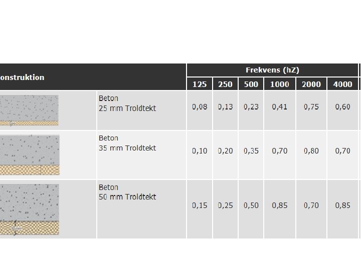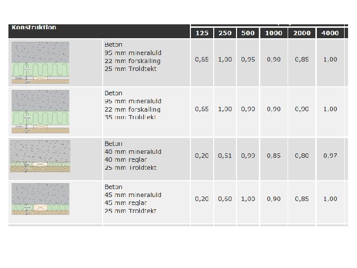 • Luftlydisolation, R´w • Trinlydniveau, L´n, w, alle belægninger • Efterklangstid(gælder typisk ved flere frekvensbånd)