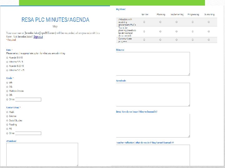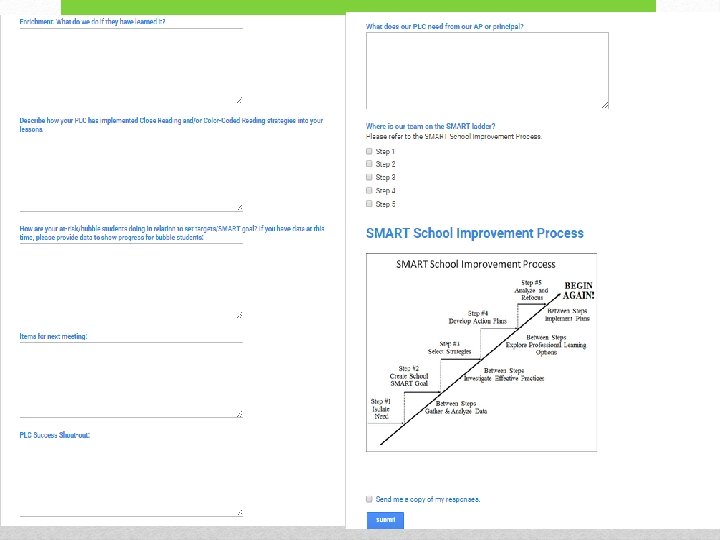 • There is a lot of collaboration among grade level PLCs but not across grade levels (vertical articulation) • Is “we” the PLC team, department, grade level? Some confusion with this but this person answered under the assumption that “we” meant PLC. • “Our school SMART goals are the foundations for our PLCs and our specific instructional planning. ” • “The SMART goal process has too much jargon that can hide what we’re really trying to do. The process makes sense, but to me the language gets in the way. ” RESA Spring SMART Survey Comments