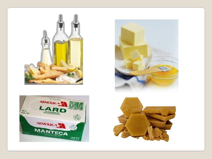 �Fats and oils are made from two kinds of molecules: glycerol and three fatty acids. �The main distinction between fats and oils is whether they’re solid or liquid at room temperature. �Fats animal source solid at room temp. �Oils plant source liquid at room temp. Lipids