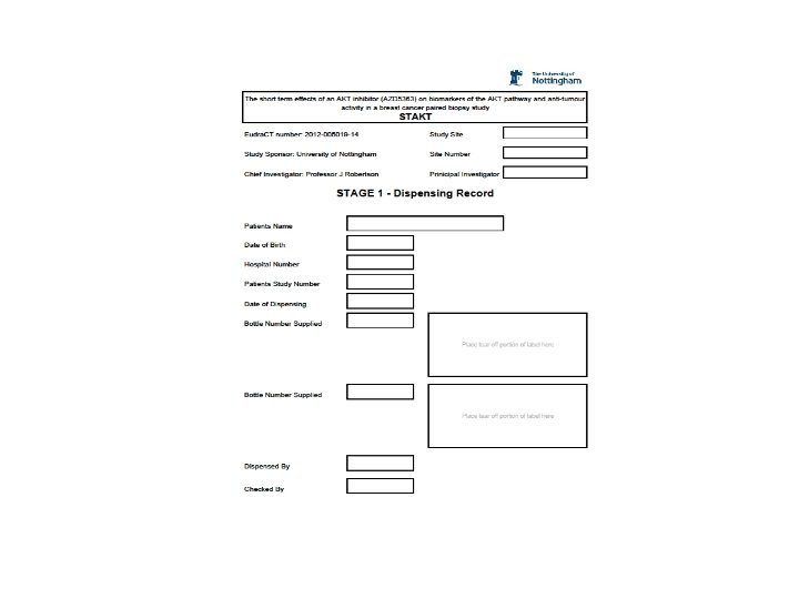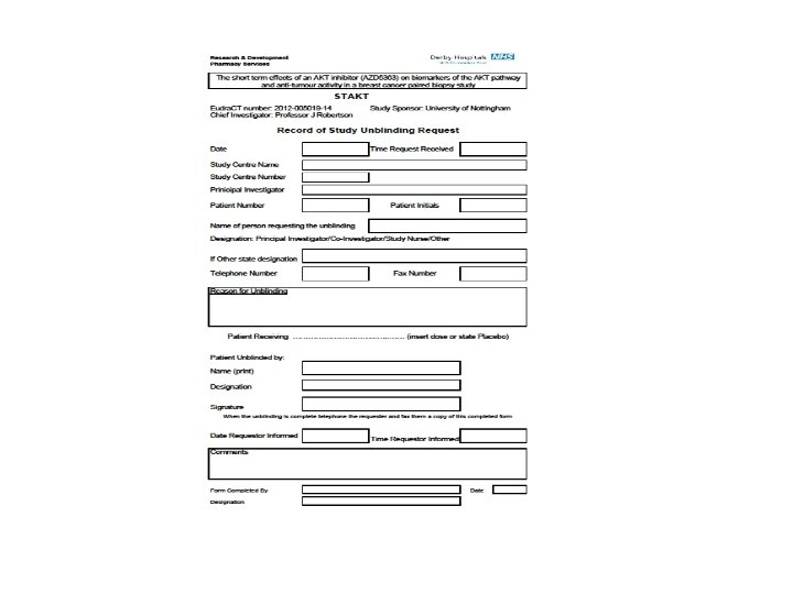 Emergency Unblinding l l An Emergency Unblinding Service will be provided by the Pharmacy, Royal Derby Hospital Available 24 hours a day, 7 days a week Provided by Pharmacy Clinical Trial Team during Office hours and On-call service outside these hours In the unlikely event of the RDH service being unavailable Cenduit will be able to unblind in emergency situations