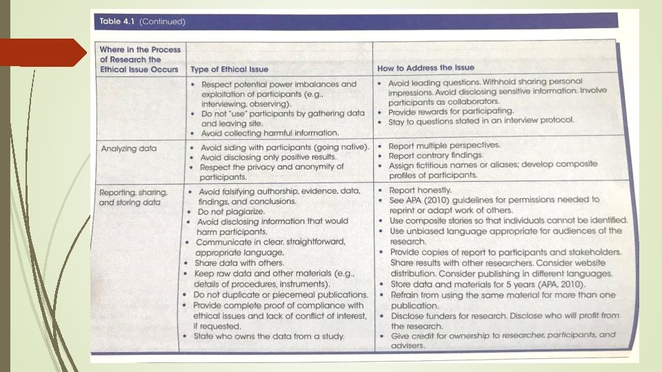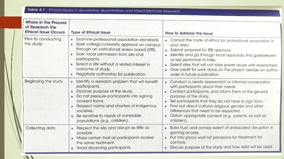 1979 Belmont Report Identifies three principles essential for human research: Respect for persons: Research should be voluntary, and researchers have the responsibility to provide potential subjects with adequate information so that the subjects can make an informed decision on whether or not they want to participate (informed consent) Beneficence: researchers have an obligation to secure the well-being (physical, psychological, economic, legal) of research participants Justice: moral requirements for research; that is, are the procedures fair, are the individuals or groups treated fairly—in effect, is the research and how the subjects are treated just?