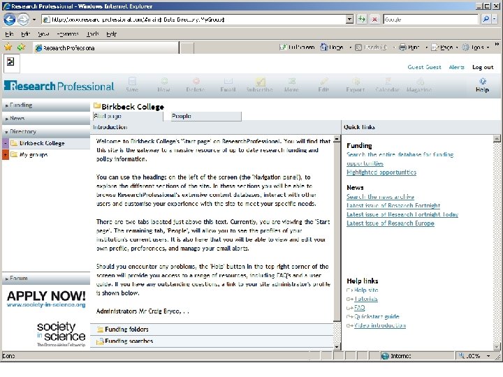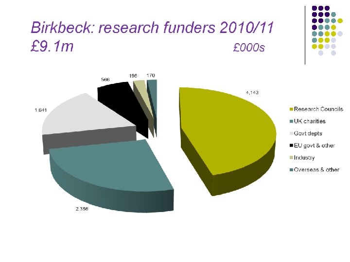 Birkbeck: research funding 2010/11: l 239 applications (83 successful to date) l Research Income £ 9, 101, 067 l 63 different funding bodies l 206 active research projects throughout all Schools l May 2012 contract value £ 57, 911, 029 l Dept of History of Art and Screen Media: l l l 2011/12: 4 applications, 1 successful to date Income 2010/11 – £ 46 k Currently 2 active projects, contract value £ 110 k
