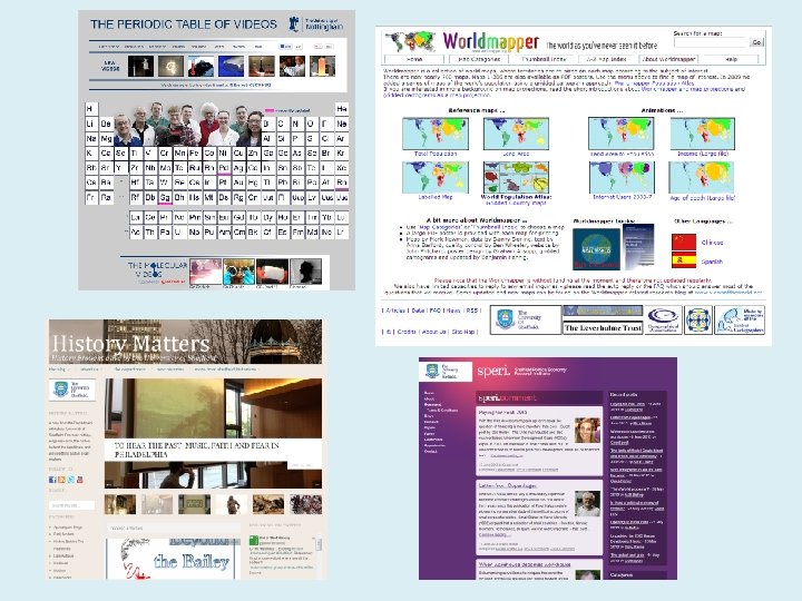 Blogs Word. Press, Blogger, Tumblr They’re all free, take your pick! Each has its strengths: - Word. Press is the most powerful and sophisticated blog - Blogger is Google-based, dynamic and benefits from SEO - Tumblr is user-friendly and very popular Once it’s up and running, take it a step further, take ownership over your area. Become famous for something, e. g. worldmapper, periodic table of videos.